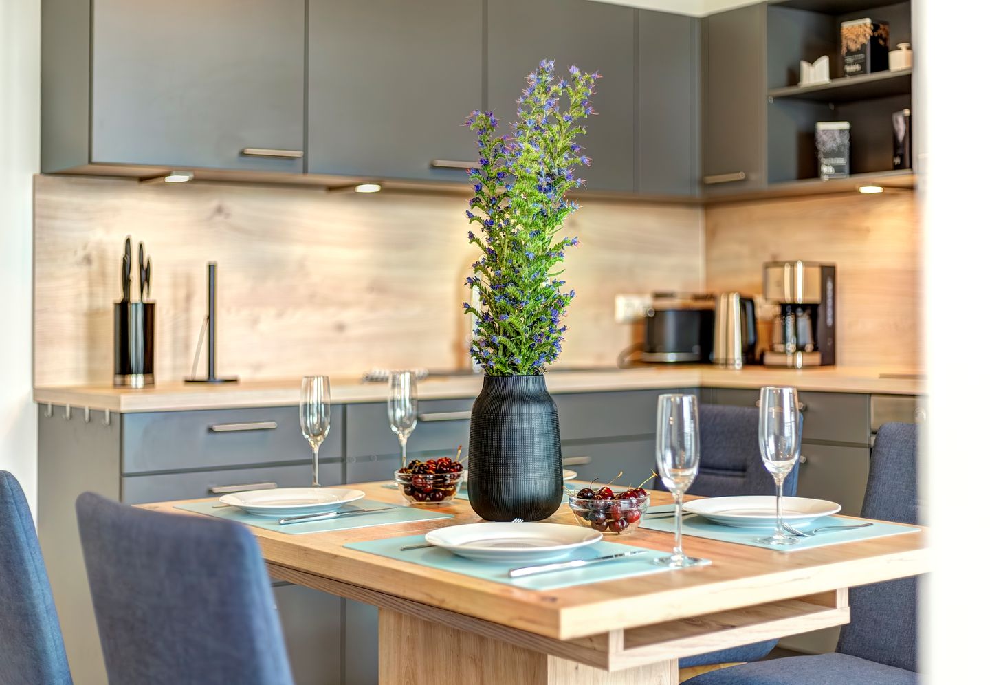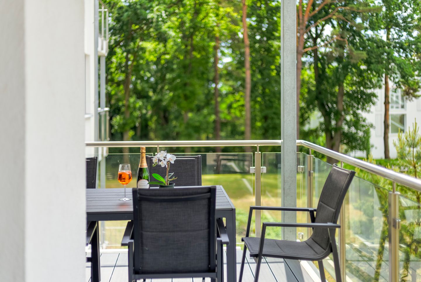 Die voll ausgestattete Küche ermöglicht Ihnen, kulinarische Köstlichkeiten zuzubereiten, die Sie dann auf dem sonnigen Balkon genießen können. Der Ausblick auf das glitzernde Haff ist zu jeder Tageszeit ein Genuss. Hier können Sie morgens Ihren Kaffee trinken oder abends bei einem Glas Wein die Stille des Waldes genießen.