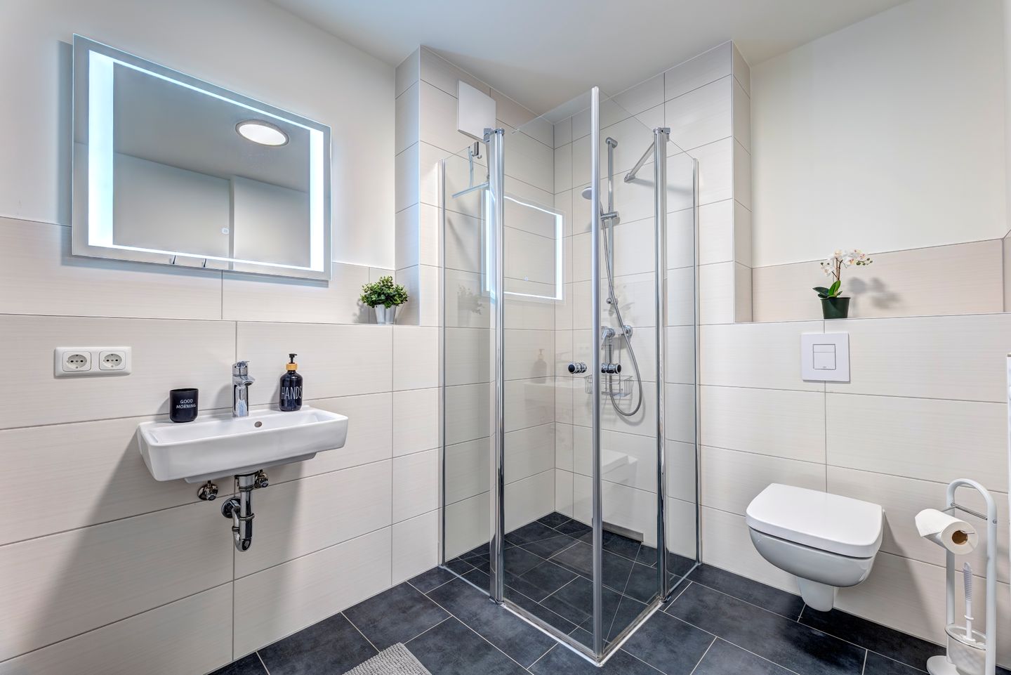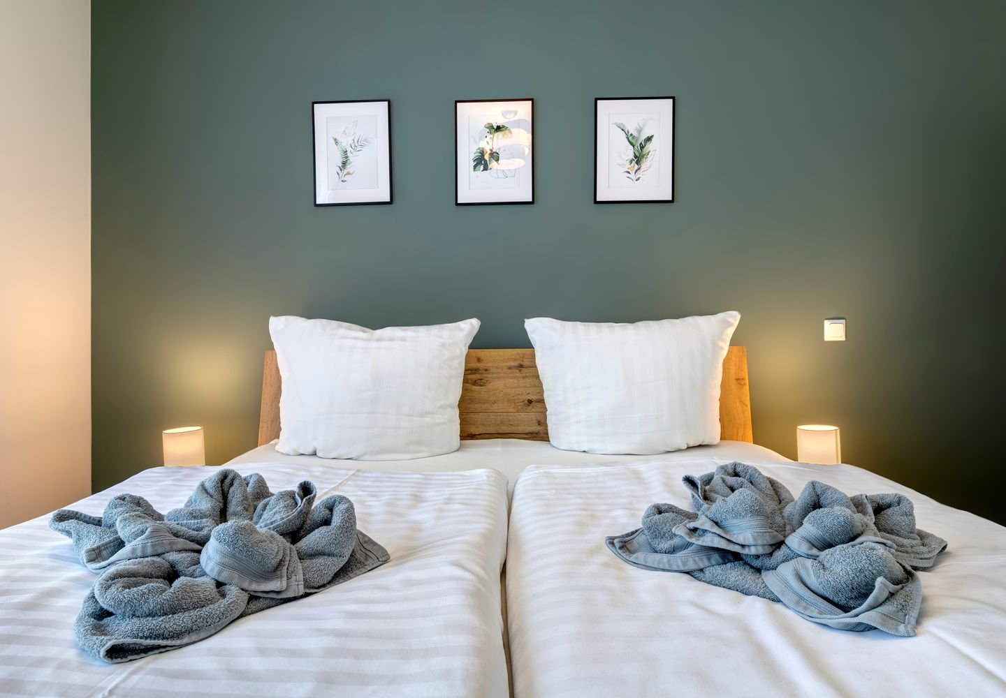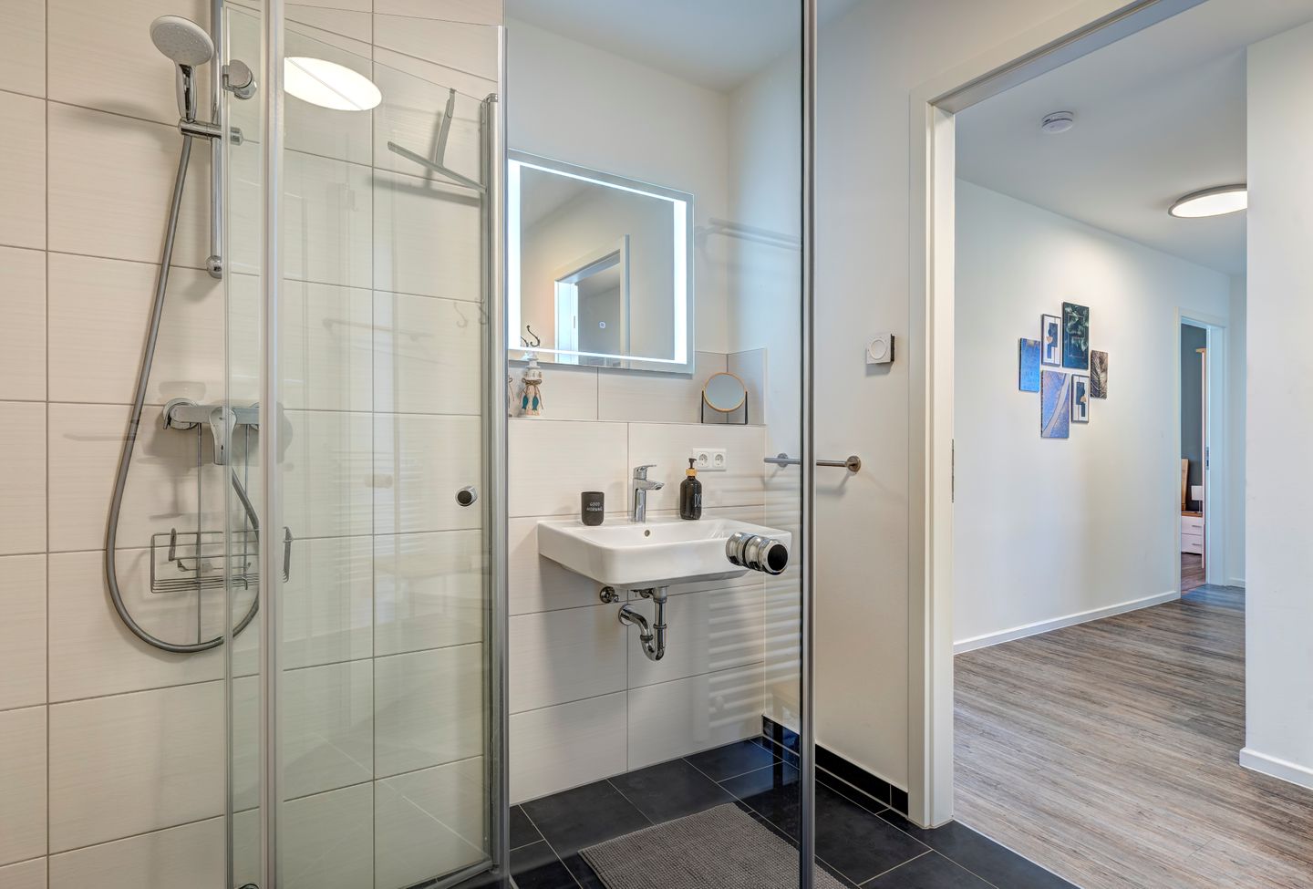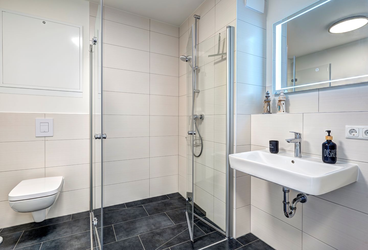 Die beide Schlafzimmer sind ein Ort der Ruhe und Entspannung. Das komfortable Boxspringbett verspricht erholsame Nächte, und die großen Fenster lassen Sie den Wald und das Haff auch vom Bett aus bewundern. Die beide Badezimmer sind modern und elegant gestaltet, mit einer geräumigen Dusche und allen Annehmlichkeiten, die Sie benötigen.
