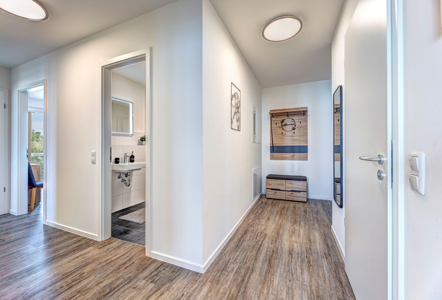 Die Ferienwohnung erstreckt sich über 81 Quadratmeter und bietet Platz für bis zu sechs Gäste. Beim Betreten der Wohnung werden Sie von einer behaglichen Atmosphäre begrüßt, die von natürlichen Holzelementen und warmen Farbtönen geprägt ist. Das Wohnzimmer ist ein einladender Rückzugsort mit bequemen Sitzgelegenheiten und großen Fenstern, die den Wald- und Haffblick in den Raum holen.